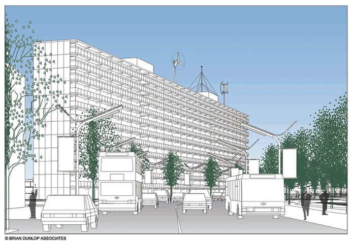 Wind Turbine Trial, Central London: installation of two 6kW turbines, one horizontal axis, one vertical axis on an existing 13 storey residential block in central London. |